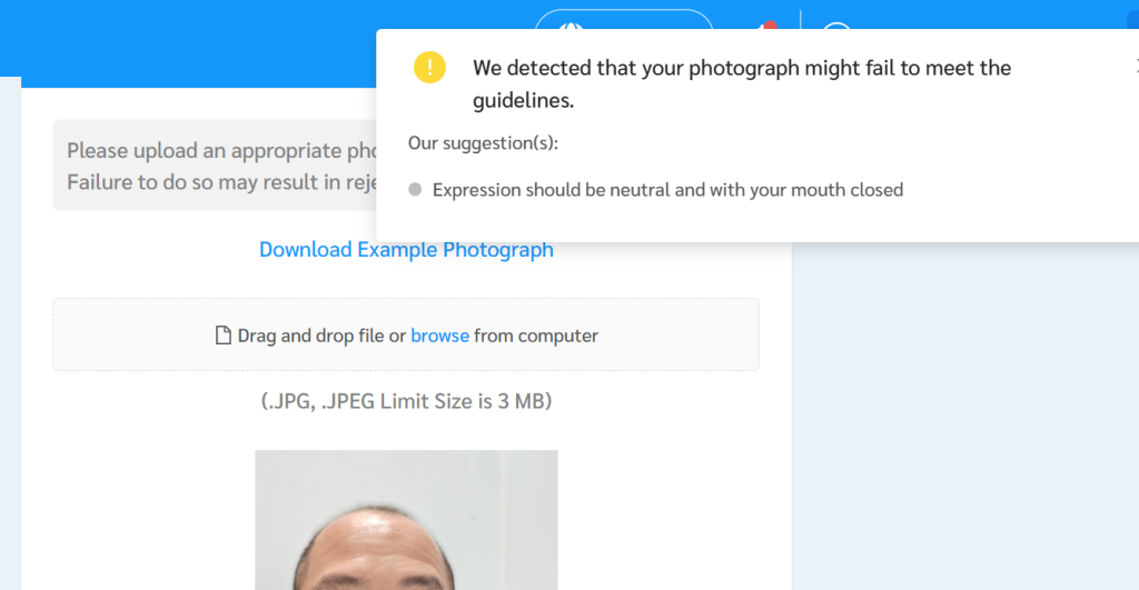 After you upload your photo, you may get an error message like below. Ignore it if you feel your photo is alright.