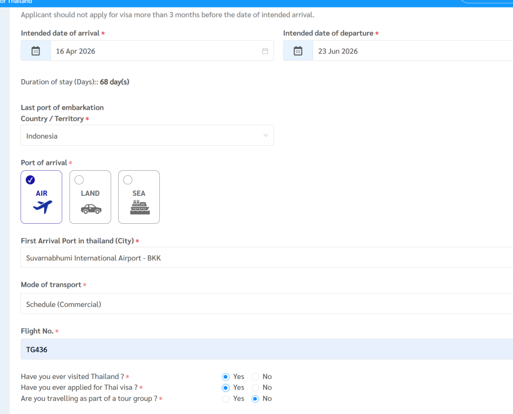 You will be asked for FLIGHT NUMBER here. Enter an available flight number here if you do not have your ticket yet. YOU DO NOT NEED TO purchase a ticket yet if you haven’t. Just enter something real. You can obtain flights details from your city to bangkok on many booking app or google.